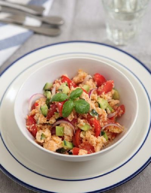 La panzanella è una pietanza estiva rustica, un piatto povero e semplice di derivazione contadina. Essendo una ricetta molto diffusa specialmente nel centro Italia, sono molte le versioni. Noi proponiamo una versione fatta con pane raffermo, pomodori, cetrioli, cipolla rossa, tonno, basilico, sale, pepe, aceto e olio. Veloce da preparare e molto saporita.