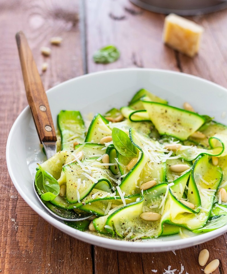 Passato il tempo, condite con dell’olio extra vergine di oliva, i pinoli leggermente tostati in padella e le scaglie di parmigiano o grana. Aggiustate di sale e pepe e amalgamate il tutto. Servite il carpaccio di zucchine con qualche fogliolina di basilico.